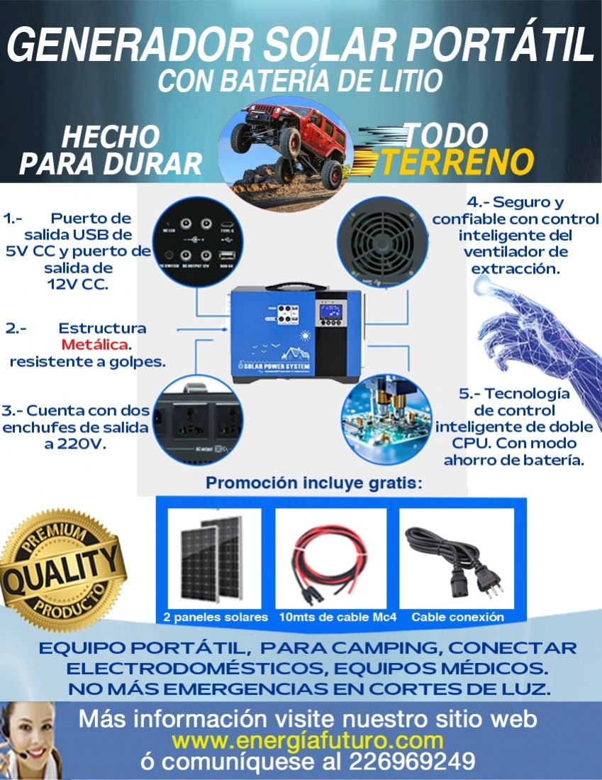 1000 watt de Potencia. Es híbrido, se carga con Energía Solar y Red Eléctrica