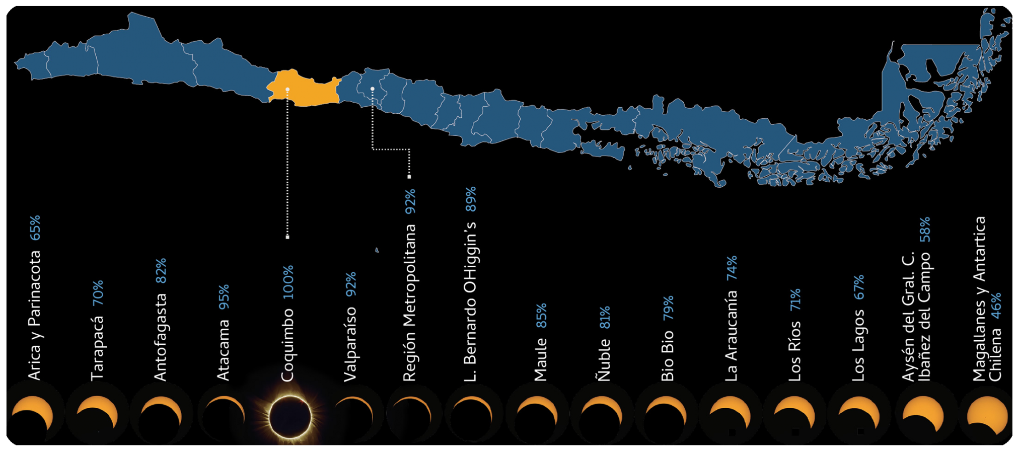 La Serena, Hurtado, La Higuera Andacollo, Vicuña, Paihuano, son algunas de las localidades de la región de Coquimbo llamada “Región Estrella” desde donde observará el eclipse total.