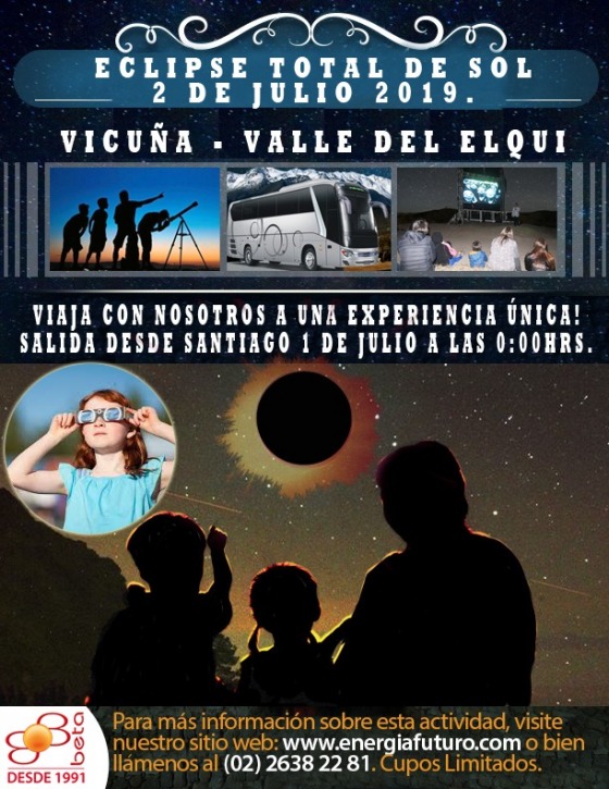 • Martes 2 de Julio.  Observación de Eclipse Solar en el punto de oscuridad total donde el día es noche
